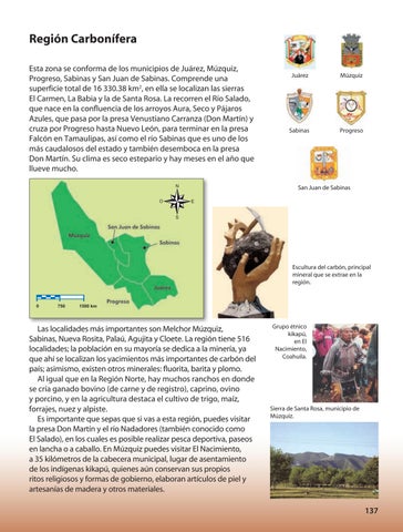 Las localidades más importantes son Melchor Múzquiz, Sabinas, Nueva Rosita, Palaú, Agujita y Cloete. La región tiene 516 localidades; la población en su mayoría se dedica a la minería, ya que ahí se localizan los yacimientos más importantes de carbón del país; asimismo, existen otros minerales: fluorita, barita y plomo. Al igual que en la Región Norte, hay muchos ranchos en donde se cría ganado bovino (de carne y de registro), caprino, ovino y porcino, y en la agricultura destaca el cultivo de trigo, maíz, forrajes, nuez y alpiste. Es importante que sepas que si vas a esta región, puedes visitar la presa Don Martín y el río Nadadores (también conocido como El Salado), en los cuales es posible realizar pesca deportiva, paseos en lancha o a caballo. En Múzquiz puedes visitar El Nacimiento, a 35 kilómetros de la cabecera municipal, lugar de asentamiento de los indígenas kikapú, quienes aún conservan sus propios ritos religiosos y formas de gobierno, elaboran artículos de piel y artesanías de madera y otros materiales.