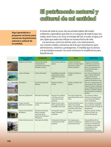 Presencia de animales endémicos y proyectos de restablecimiento de fauna y recuperación de áreas determinadas u ecoturísticas. Venado cola blanca y Sus más de 160 pozos de coyote. agua cristalina albergan 9 especies de peces endémicos, así como 16 especies de plantas únicas. Coyote y venado cola Este río es especial para los blanca. municipios de San Juan de Sabinas, Sabinas y Múzquiz, ya que alberga especies de plantas y animales, además de servir para la recreación familiar. Oso negro, águila real, Sus mantos acuíferos guacamaya enana, entre abastecen de agua a todo el municipio de Saltillo y otras. áreas conurbanas. Coyote, tlacuache, zorro, Una cantidad considerable víbora de cascabel, de sus especies vegetales y liebre y tortuga barrilera animales están en riesgo de o de llano, entre otras. desaparecer. Víbora, correcaminos Algunas especies de flora y ratas. y fauna cuentan con protección especial.