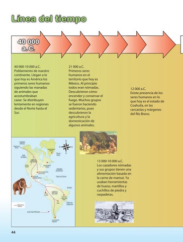 Línea del tiempo 40 000 a. C. 40 000-10 000 a.C. Poblamiento de nuestro continente. Llegan a lo que hoy es América los primeros seres humanos siguiendo las manadas de animales que acostumbraban cazar. Se distribuyen lentamente en regiones desde el Norte hasta el Sur.