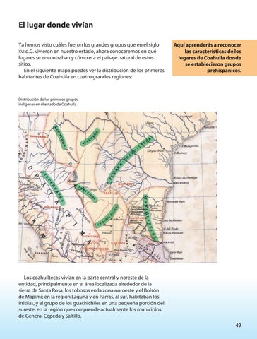 El lugar donde vivían Ya hemos visto cuáles fueron los grandes grupos que en el siglo xvi d.C. vivieron en nuestro estado, ahora conoceremos en qué lugares se encontraban y cómo era el paisaje natural de estos sitios. En el siguiente mapa puedes ver la distribución de los primeros habitantes de Coahuila en cuatro grandes regiones: