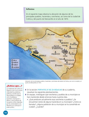 Reflexiona En el siguiente mapa observa la ubicación de algunos de los principales pueblos, haciendas y rancherías, así como de la ciudad de Colima y del puerto de Manzanillo en el año de 1870.