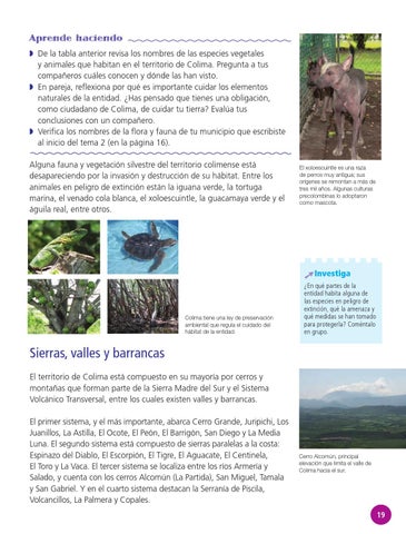 Aprende haciendo ◗◗ De la tabla anterior revisa los nombres de las especies vegetales y animales que habitan en el territorio de Colima. Pregunta a tus compañeros cuáles conocen y dónde las han visto. ◗◗ En pareja, reflexiona por qué es importante cuidar los elementos naturales de la entidad. ¿Has pensado que tienes una obligación, como ciudadano de Colima, de cuidar tu tierra? Evalúa tus conclusiones con un compañero. ◗◗ Verifica los nombres de la flora y fauna de tu municipio que escribiste al inicio del tema 2 (en la página 16). Alguna fauna y vegetación silvestre del territorio colimense está desapareciendo por la invasión y destrucción de su hábitat. Entre los animales en peligro de extinción están la iguana verde, la tortuga marina, el venado cola blanca, el xoloescuintle, la guacamaya verde y el águila real, entre otros.