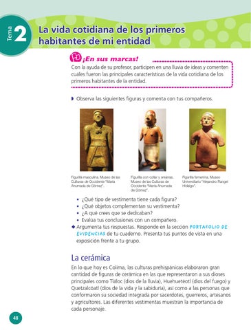 La cerámica En lo que hoy es Colima, las culturas prehispánicas elaboraron gran cantidad de figuras de cerámica en las que representaron a sus dioses principales como Tláloc (dios de la lluvia), Huehuetéotl (dios del fuego) y Quetzalcóatl (dios de la vida y la sabiduría), así como a las personas que conformaron su sociedad integrada por sacerdotes, guerreros, artesanos y agricultores. Las diferentes vestimentas muestran la importancia de cada personaje. 48