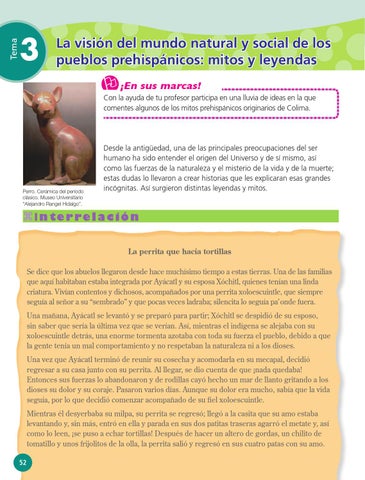 Interre l a c i ó n La perrita que hacía tortillas Se dice que los abuelos llegaron desde hace muchísimo tiempo a estas tierras. Una de las familias que aquí habitaban estaba integrada por Ayácatl y su esposa Xóchitl, quienes tenían una linda criatura. Vivían contentos y dichosos, acompañados por una perrita xoloescuintle, que siempre seguía al señor a su “sembrado” y que pocas veces ladraba; silencita lo seguía pa’ onde fuera. Una mañana, Ayácatl se levantó y se preparó para partir; Xóchitl se despidió de su esposo, sin saber que sería la última vez que se verían. Así, mientras el indígena se alejaba con su xoloescuintle detrás, una enorme tormenta azotaba con toda su fuerza el pueblo, debido a que la gente tenía un mal comportamiento y no respetaban la naturaleza ni a los dioses. Una vez que Ayácatl terminó de reunir su cosecha y acomodarla en su mecapal, decidió regresar a su casa junto con su perrita. Al llegar, se dio cuenta de que ¡nada quedaba! Entonces sus fuerzas lo abandonaron y de rodillas cayó hecho un mar de llanto gritando a los dioses su dolor y su coraje. Pasaron varios días. Aunque su dolor era mucho, sabía que la vida seguía, por lo que decidió comenzar acompañado de su fiel xoloescuintle. Mientras él desyerbaba su milpa, su perrita se regresó; llegó a la casita que su amo estaba levantando y, sin más, entró en ella y parada en sus dos patitas traseras agarró el metate y, así como lo leen, ¡se puso a echar tortillas! Después de hacer un altero de gordas, un chilito de tomatillo y unos frijolitos de la olla, la perrita salió y regresó en sus cuatro patas con su amo. 52