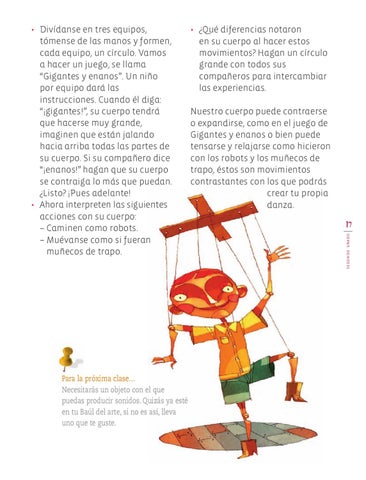 • Divídanse en tres equipos, tómense de las manos y formen, cada equipo, un círculo. Vamos a hacer un juego, se llama “Gigantes y enanos”. Un niño por equipo dará las instrucciones. Cuando él diga: “¡gigantes!”, su cuerpo tendrá que hacerse muy grande, imaginen que están jalando hacia arriba todas las partes de su cuerpo. Si su compañero dice “¡enanos!” hagan que su cuerpo se contraiga lo más que puedan. ¿Listo? ¡Pues adelante! • Ahora interpreten las siguientes acciones con su cuerpo: – Caminen como robots. – Muévanse como si fueran muñecos de trapo.