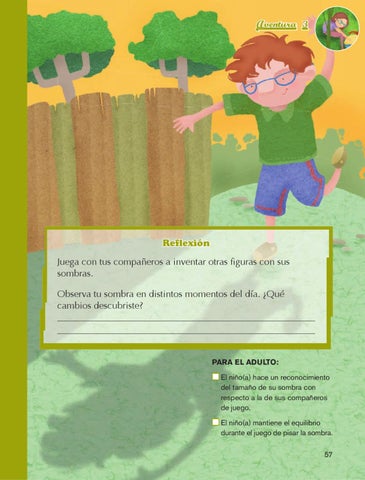 PARA EL ADULTO: El niño(a) hace un reconocimiento del tamaño de su sombra con respecto a la de sus compañeros de juego. El niño(a) mantiene el equilibrio durante el juego de pisar la sombra. 57