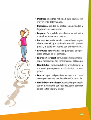 • Destreza motora: habilidad para realizar un movimiento determinado. • Eficacia: capacidad de realizar una actividad y lograr un efecto deseado. • Empatía: facultad de identificarse emocional y mentalmente con otra persona. • Entonación: variación del tono de la voz según el sentido de lo que se dice, la emoción que ex presa y el estilo o el acento con el que se habla. • Estímulos sensoriales: cualquier cosa que per cibes a través de los sentidos. • Expresión corporal: comunicación de un mensa je por medio de gestos y movimientos del cuerpo. • Flexibilidad: capacidad de las articulaciones y músculos para ejecutar movimientos con am plitud. • Fuerza: capacidad para levantar, soportar o ven cer un peso o masa, mediante la acción muscular. • Habilidades motrices: Capacidades para reali zar un movimiento con facilidad, como caminar, correr, saltar, trepar y lanzar.