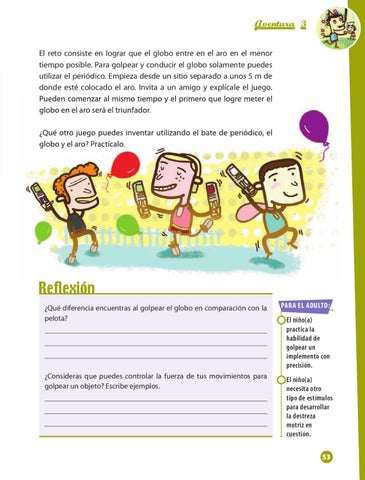 Aventura 3 El reto consiste en lograr que el globo entre en el aro en el menor tiempo posible. Para golpear y conducir el globo solamente puedes utilizar el periódico. Empieza desde un sitio separado a unos 5 m de donde esté colocado el aro. Invita a un amigo y explícale el juego. Pueden comenzar al mismo tiempo y el primero que logre meter el globo en el aro será el triunfador. ¿Qué otro juego puedes inventar utilizando el bate de periódico, el globo y el aro? Practícalo.