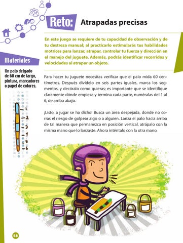 En este juego se requiere de tu capacidad de observación y de tu destreza manual; al practicarlo estimularás tus habilidades motrices para lanzar, atrapar, controlar tu fuerza y dirección en el manejo del juguete. Además, podrás identificar recorridos y velocidades al atrapar un objeto. Para hacer tu juguete necesitas verificar que el palo mida 60 centímetros. Después divídelo en seis partes iguales, marca los segmentos, y decóralo como quieras; es importante que se identifique claramente dónde empieza y termina cada parte, numéralas del 1 al 6, de arriba abajo. ¡Listo, a jugar se ha dicho! Busca un área despejada, donde no corras el riesgo de golpear algo o a alguien. Lanza el palo hacia arriba de tal manera que permanezca en posición vertical, atrápalo con la misma mano que lo lanzaste. Ahora inténtalo con la otra mano.