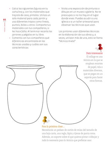 • Calca las siguientes figuras en tu cartulina y, con los materiales que trajiste de casa, píntalas. Utiliza un solo material para cada jarrón y usa diferentes trazos como líneas, puntos, bolas u otros. Comparte tus materiales con tus compañeros, si les hace falta. Al terminar recorta los jarrones y pégalos en tu libro. • Comenta con tus compañeros qué diferencias encontraste en las técnicas usadas y cuáles son sus características.