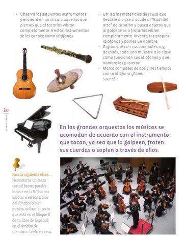 • Utiliza los materiales de reúso que llevaste a clase o acude al “Baúl del arte” de tu salón y busca objetos que al golpearlos o frotarlos vibren completamente. Inventa tus propios idiófonos y ponles un nombre. • Organízate con tus compañeros y, después, cada uno muestre a la clase cómo funcionan sus idiófonos y qué nombre les pusieron. • Marca compases de dos y tres tiempos con tu idiófono. ¿Cómo suena?