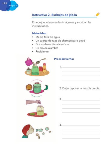 Instructivo 2. Burbujas de jabón En equipo, observen las imágenes y escriban las instrucciones. Materiales: • Media taza de agua • Un cuarto de taza de champú para bebé • Dos cucharaditas de azúcar • Un aro de alambre • Recipiente Procedimiento: 1.
