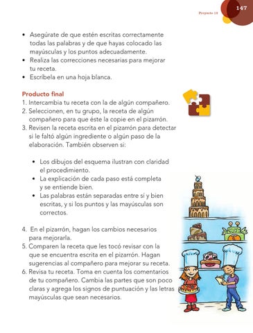 • Asegúrate de que estén escritas correctamente todas las palabras y de que hayas colocado las mayúsculas y los puntos adecuadamente. • Realiza las correcciones necesarias para mejorar tu receta. • Escríbela en una hoja blanca. Producto final 1. Intercambia tu receta con la de algún compañero. 2. Seleccionen, en tu grupo, la receta de algún compañero para que éste la copie en el pizarrón. 3. Revisen la receta escrita en el pizarrón para detectar si le faltó algún ingrediente o algún paso de la elaboración. También observen si: • Los dibujos del esquema ilustran con claridad el procedimiento. • La explicación de cada paso está completa y se entiende bien. • Las palabras están separadas entre sí y bien escritas, y si los puntos y las mayúsculas son correctos. 4. En el pizarrón, hagan los cambios necesarios para mejorarla. 5. Comparen la receta que les tocó revisar con la que se encuentra escrita en el pizarrón. Hagan sugerencias al compañero para mejorar su receta. 6. Revisa tu receta. Toma en cuenta los comentarios de tu compañero. Cambia las partes que son poco claras y agrega los signos de puntuación y las letras mayúsculas que sean necesarios.