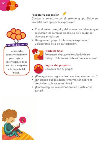 • Con el texto corregido, elaboren un cartel en el que se ilustren los cambios en el ciclo de vida del ser vivo que estudiaron. • Designen en grupo los turnos de exposición y elaboren la lista de participación. Producto final Presenten al grupo el resultado de su trabajo. Utilicen los carteles que elaboraron. Logros del proyecto Comenta con tu grupo: • ¿Para qué sirve registrar los cambios de un ser vivo? • ¿En dónde puedes buscar información sobre el crecimiento de los seres vivos? • ¿Cómo elegiste la información que usaste en el cartel?