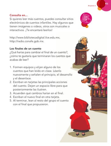 Consulta en... Si quieres leer más cuentos, puedes consultar sitios electrónicos de cuentos infantiles. Hay algunos que tienen imágenes o videos, otros son musicales o interactivos. ¡Te encantará leerlos! http://www.bibliotecadigital.ilce.edu.mx, http://radio.conafe.gob.mx. Los finales de un cuento ¿Qué harías para cambiar el final de un cuento?, ¿cómo te gustaría que terminaran los cuentos que acabas de leer? 1. Formen equipos y elijan alguno de los cuentos que han leído en clase. Léanlo nuevamente y señalen el principio, el desarrollo y el desenlace. 2. Escriban en tarjetas las principales acciones del cuento. Dejen un espacio libre para que posteriormente las ilustren. 3. Acuerden qué cambios harían en el final. 4. Escriban el nuevo final en otra tarjeta. 5. Al terminar, lean al resto del grupo el cuento con el final que propusieron.