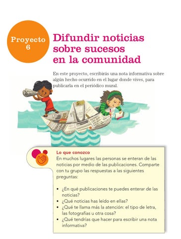 Lo que conozco En muchos lugares las personas se enteran de las noticias por medio de las publicaciones. Comparte con tu grupo las respuestas a las siguientes preguntas: • ¿En qué publicaciones te puedes enterar de las noticias? • ¿Qué noticias has leído en ellas? • ¿Qué te llama más la atención: el tipo de letra, las fotografías u otra cosa? • ¿Qué tendrías que hacer para escribir una nota informativa?
