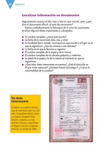 Localizar información en documentos Seguramente conoces el día, mes y año en que naciste, pero ¿qué dice el documento oficial, el acta de nacimiento? Revisa cuidadosamente la fotocopia de tu acta de nacimiento; localiza algunos datos importantes y subráyalos: ■ ■ ■ ■ ■ ■ ■ ■
