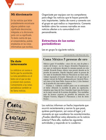 Mi diccionario En las noticias que leíste probablemente encontraste algunas palabras cuyo significado desconocías; intégralas a tu diccionario junto con su significado. Te darás cuenta de que, al comprenderlas, podrás emplearlas en las notas informativas que escribas.