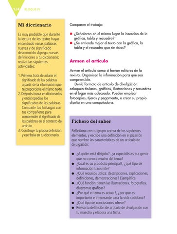 ¿A quién está dirigido?, ¿a especialistas o a gente que no conoce mucho del tema? ¿Cuál es su propósito principal?, ¿qué tipo de información transmite? ¿Qué recursos utiliza: descripciones, explicaciones, definiciones, demostraciones? Ejemplifica. ¿Qué función tienen las ilustraciones, fotografías, diagramas gráficas? ¿Por qué el tema es actual?, ¿por qué es importante e interesante para la vida cotidiana? ¿Qué tipo de conclusiones ofrece? Revisa tu definición de artículo de divulgación con tu maestro y elabora una ficha.