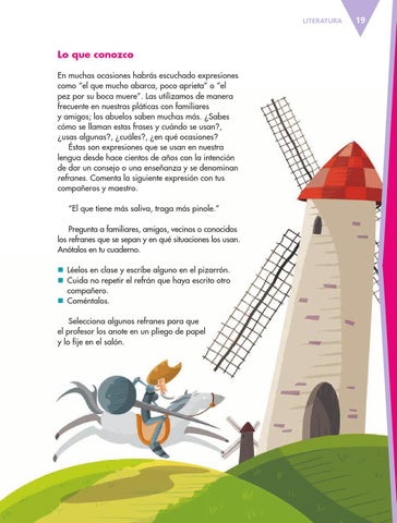 Lo que conozco En muchas ocasiones habrás escuchado expresiones como “el que mucho abarca, poco aprieta” o “el pez por su boca muere”. Las utilizamos de manera frecuente en nuestras pláticas con familiares y amigos; los abuelos saben muchas más. ¿Sabes cómo se llaman estas frases y cuándo se usan?, ¿usas algunas?, ¿cuáles?, ¿en qué ocasiones? Éstas son expresiones que se usan en nuestra lengua desde hace cientos de años con la intención de dar un consejo o una enseñanza y se denominan refranes. Comenta la siguiente expresión con tus compañeros y maestro. “El que tiene más saliva, traga más pinole.” Pregunta a familiares, amigos, vecinos o conocidos los refranes que se sepan y en qué situaciones los usan. Anótalos en tu cuaderno. n Léelos en clase y escribe alguno en el pizarrón. n Cuida no repetir el refrán que haya escrito otro compañero. n Coméntalos. Selecciona algunos refranes para que el profesor los anote en un pliego de papel y lo fije en el salón.