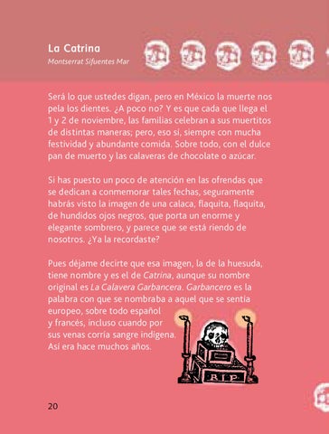 Será lo que ustedes digan, pero en México la muerte nos pela los dientes. ¿A poco no? Y es que cada que llega el 1 y 2 de noviembre, las familias celebran a sus muertitos de distintas maneras; pero, eso sí, siempre con mucha festividad y abundante comida. Sobre todo, con el dulce pan de muerto y las calaveras de chocolate o azúcar. Si has puesto un poco de atención en las ofrendas que se dedican a conmemorar tales fechas, seguramente habrás visto la imagen de una calaca, flaquita, flaquita, de hundidos ojos negros, que porta un enorme y elegante sombrero, y parece que se está riendo de nosotros. ¿Ya la recordaste? Pues déjame decirte que esa imagen, la de la huesuda, tiene nombre y es el de Catrina, aunque su nombre original es La Calavera Garbancera. Garbancero es la palabra con que se nombraba a aquel que se sentía europeo, sobre todo español y francés, incluso cuando por sus venas corría sangre indígena. Así era hace muchos años.