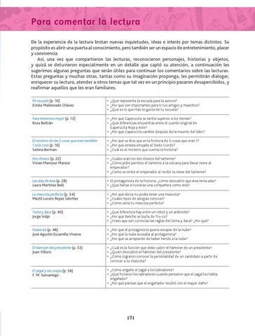 Para comentar la lectura De la experiencia de la lectura brotan nuevas inquietudes, ideas e interés por temas distintos. Su propósito es abrir una puerta al conocimiento, pero también ser un espacio de entretenimiento, placer y convivencia. Así, una vez que compartieron las lecturas, reconocieron personajes, historias y objetos, y quizá se detuvieron especialmente en un detalle que captó su atención, a continuación les sugerimos algunas preguntas que serán útiles para continuar los comentarios sobre las lecturas. Estas preguntas y muchas otras, tantas como su imaginación proponga, les permitirán dialogar, enriquecer su lectura, atender a otros temas que tal vez en un principio pasaron desapercibidos, y reafirmar aquellos que les eran familiares. Mi escuela (p. 10) Estela Maldonado Chávez
