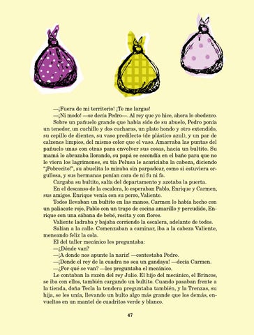 —¡Fuera de mi territorio! ¡Te me largas! —¡Ni modo! —se decía Pedro—. Al rey que yo hice, ahora lo obedezco. Sobre un pañuelo grande que había sido de su abuelo, Pedro ponía un tenedor, un cuchillo y dos cucharas, un plato hondo y otro extendido, su cepillo de dientes, su vaso predilecto (de plástico azul), y un par de calzones limpios, del mismo color que el vaso. Amarraba las puntas del pañuelo unas con otras para envolver sus cosas, hacía un bultito. Su mamá lo abrazaba llorando, su papá se escondía en el baño para que no le viera los lagrimones, su tía Pelusa le acariciaba la cabeza, diciendo “¡Pobrecito!”, su abuelita lo miraba sin parpadear, como si estuviera orgullosa, y sus hermanas ponían cara de ni fu ni fa. Cargaba su bultito, salía del departamento y azotaba la puerta. En el descanso de la escalera, lo esperaban Pablo, Enrique y Carmen, sus amigos. Enrique venía con su perro, Valiente. Todos llevaban un bultito en las manos, Carmen lo había hecho con un paliacate rojo, Pablo con un trapo de cocina amarillo y percudido, Enrique con una sábana de bebé, rosita y con flores. Valiente ladraba y bajaba corriendo la escalera, adelante de todos. Salían a la calle. Comenzaban a caminar, iba a la cabeza Valiente, meneando feliz la cola. El del taller mecánico les preguntaba: —¿Dónde van? —¡A donde nos apunte la nariz! —contestaba Pedro. —¡Donde el rey de la cuadra no sea un gandaya! —decía Carmen. —¿Por qué se van? —les preguntaba el mecánico. Le contaban la razón del rey Julio. El hijo del mecánico, el Brincos, se iba con ellos, también cargando un bultito. Cuando pasaban frente a la tienda, doña Tecla la tendera preguntaba también, y la Trenzas, su hija, se les unía, llevando un bulto algo más grande que los demás, envueltos en un mantel de cuadritos verde y blanco. 47