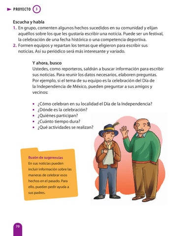 Escucha y habla 1. En grupo, comenten algunos hechos sucedidos en su comunidad y elijan aquéllos sobre los que les gustaría escribir una noticia. Puede ser un festival, la celebración de una fecha histórica o una competencia deportiva. 2. Formen equipos y repartan los temas que eligieron para escribir sus noticias. Así su periódico será más interesante y variado. Y ahora, busco Ustedes, como reporteros, saldrán a buscar información para escribir sus noticias. Para reunir los datos necesarios, elaboren preguntas. Por ejemplo, si el tema de su equipo es la celebración del Día de la Independencia de México, pueden preguntar a sus amigos y vecinos: