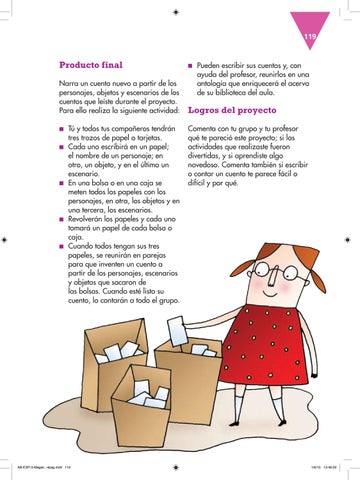 tres trozos de papel o tarjetas. ■■ Cada uno escribirá en un papel; el nombre de un personaje; en otro, un objeto, y en el último un escenario. ■■ En una bolsa o en una caja se meten todos los papeles con los personajes, en otra, los objetos y en una tercera, los escenarios. ■■ Revolverán los papeles y cada uno tomará un papel de cada bolsa o caja. ■■ Cuando todos tengan sus tres papeles, se reunirán en parejas para que inventen un cuento a partir de los personajes, escenarios y objetos que sacaron de las bolsas. Cuando esté listo su cuento, lo contarán a todo el grupo.