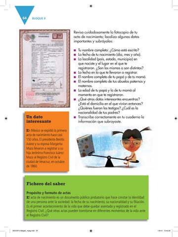 que naciste y el lugar en el que te registraron. ¿Son los mismos o son distintos? ■■ La fecha en la que te llevaron a registrar. ■■ El nombre completo de tu papá y de tu mamá. ■■ El nombre completo de tus abuelos paternos y maternos. ■■ La edad de tu papá y la de tu mamá al momento en que te registraron. ■■ ¿Qué otros datos interesantes encuentras? ¿Está el domicilio en el que vivían entonces? ¿Quiénes fueron los testigos? ¿Cuál es la nacionalidad de tus padres? ■■ Transcribe correctamente en tu cuaderno la información que subrayaste.