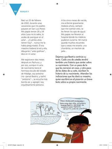 Dejemos que Beatriz continúe su texto. Cada uno de ustedes tendrá también una historia que contar sobre su nacimiento. Con un poco de lo que les narraron en casa, y otro poco de los datos de su acta, escriban la historia de su nacimiento. Atiendan las indicaciones que les dará su maestro, quien escribirá en el pizarrón un breve texto sobre su propio nacimiento.