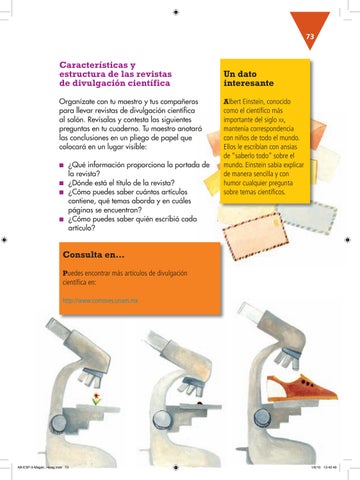 Características y estructura de las revistas de divulgación científica Organízate con tu maestro y tus compañeros para llevar revistas de divulgación científica al salón. Revísalas y contesta las siguientes preguntas en tu cuaderno. Tu maestro anotará las conclusiones en un pliego de papel que colocará en un lugar visible: ■■ ¿Qué información proporciona la portada de