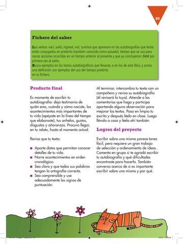 Revisa en grupo el rotafolio donde escribiste las características Fichero del de una saber autobiografía. Agrega o sustituye lo que creas necesario, pues te servirá Los verbos nací , salió, ingresé , viví , tuvimos queanota aparecen en las autobiografías que leíste de guía para escribir tu texto. Por ejemplo, están conjugados en pretérito conocido como pasado), tiempo que se usa para que una autobiografía está (también escrita en pretérito, narrar acciones ocurridassucesos en un tiempo al presente y que ya concluyeron: Entré por retoma los principales de laanterior vida, centra al salón. alprimera autor vez como el personaje principal, se escribe ejemplos en los(nací, textos crecí, autobiográficos que llevaste, o en los de este libro, y anota enBusca primera persona lloré, amé...). una definición con ejemplos del uso del tiempo pretérito ¿Qué otras características identificaste? en tu fichero.