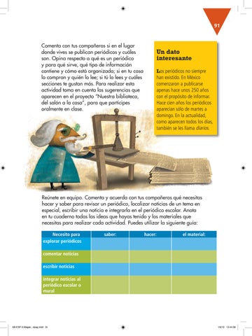 Comenta con tus compañeros si en el lugar donde vives se publican periódicos y cuáles son. Opina respecto a qué es un periódico y para qué sirve, qué tipo de información contiene y cómo está organizada; si en tu casa lo compran y quién lo lee; si tú lo lees y cuáles secciones te gustan más. Para realizar esta actividad toma en cuenta las sugerencias que aparecen en el proyecto “Nuestra biblioteca, del salón a la casa”, para que participes oralmente en clase.
