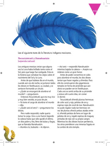 Lee el siguiente texto de la literatura indígena mexicana. Tecuciztécatl y Nanahuatzin Leyenda nahuatl Los antiguos mexicas creían que alguna vez la Luna había brillado tanto como el Sol, pero que luego fue castigada. Ésta es la historia que contaban los viejos sobre el nacimiento del Sol y la Luna. Antes de que hubiese día en el mundo, cuando aún era de noche, se juntaron todos los dioses en Teotihuacan, su ciudad, y se sentaron formando un círculo. —¿Quién se encargará de alumbrar el mundo? —preguntaron. Entonces Tecuciztécatl, que era muy rico y muy bien vestido, se puso de pie. —Yo tomo el cargo de alumbrar el mundo —dijo. —¿Quién será el otro? —preguntaron los dioses. Pero nadie respondió, nadie quería tomar la carga. Uno a uno fueron bajando la cabeza hasta que sólo quedó el último, un dios pobre y feo, lleno de bubas y llagas, que se llamaba Nanahuatzin. —Alumbra tú, bubosito —le dijeron.