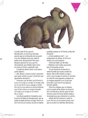 Cuando salió el Sol, que era Nanahuatzin, se veía muy colorado, parecía que se contoneaba de una parte a la otra. Brillaba tanto que nadie lo podía mirar directamente. Pero poco después apareció la Luna, que era Tecuciztécatl, que brillaba tanto como él y tenía el mismo resplandor rojo. Cuando los dioses vieron a los astros juntos dijeron: —¡Oh, dioses! ¿Cómo es esto? ¿Será bien que vayan ambos a la par? ¿Será bien que igualmente alumbren? Entonces uno de ellos corrió hacia la Luna y le arrojó un conejo. El conejo cayó en la cara de la Luna y apagó su brillo. Por eso la Luna ahora es menos brillante que el Sol y tiene un conejo marcado con todo y sus orejas en el centro de su rostro. Los dioses quedaron tranquilos, pues el único Sol debía ser Nanahuatzin, que se había arrojado primero al fuego. Pero ni el Sol ni la Luna se movían, los dos se habían