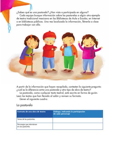 ¿Saben qué es una pastorela? ¿Han visto o participado en alguna? Cada equipo busque información sobre las pastorelas o algún otro ejemplo de teatro tradicional mexicano en las Bibliotecas de Aula o Escolar, en Internet o en bibliotecas públicas. Una vez localizada la información, llévenla a clase para trabajar con ella.