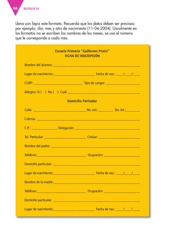 Llena con lápiz este formato. Recuerda que los datos deben ser precisos; por ejemplo, día, mes y año de nacimiento (11-04-2004). Usualmente en los formatos no se escriben los nombres de los meses, se usa el número que le corresponde a cada mes. Escuela Primaria “Guillermo Prieto” FICHA DE INSCRIPCIÓN Nombre del alumno: ________________________________________________ Lugar de nacimiento:_______________________ Fecha de nac.: ____/____/ ____ CURP: ___________________________ Tipo de sangre: ___________________ Alérgico: Si (