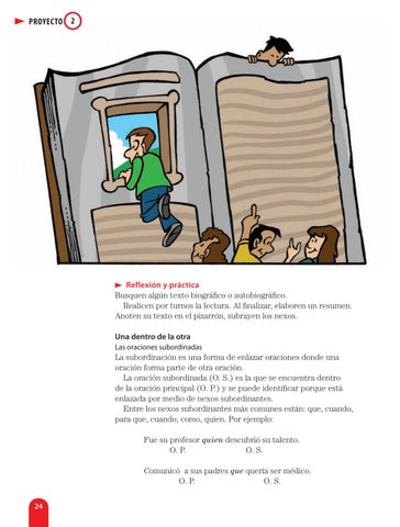 Reflexión y práctica Busquen algún texto biográfico o autobiográfico. Realicen por turnos la lectura. Al finalizar, elaboren un resumen. Anoten su texto en el pizarrón, subrayen los nexos. Una dentro de la otra Las oraciones subordinadas