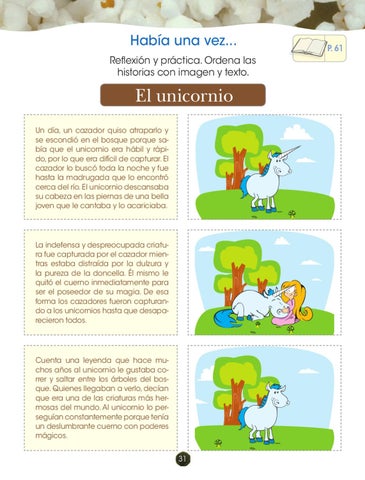 Cuenta una leyenda que hace muchos años al unicornio le gustaba correr y saltar entre los árboles del bosque. Quienes llegaban a verlo, decían que era una de las criaturas más hermosas del mundo. Al unicornio lo perseguían constantemente porque tenía un deslumbrante cuerno con poderes mágicos. 31