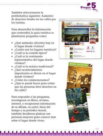 También seleccionaron la problemática siguiente: Aumento de desechos tirados en las calles por los turistas. Para desarrollar la información que contendría la guía turística se plantearon preguntas como: • ¿Qué animales silvestres hay en el lugar donde vivimos? • ¿Cuáles son los lugares turísticos? • ¿Cuál es la comida típica? • ¿Cuál es la vestimenta representativa del lugar donde vivimos? • ¿Cuál es la música tradicional? • ¿Qué acontecimientos importantes se dieron en el lugar donde vivimos? • ¿Cómo los conmemoramos? • ¿Qué se puede hacer para evitar que las personas tiren desechos en las calles? Para responder a las preguntas, investigaron en libros, revistas, internet, y recuperaron información de su álbum, su cartel, línea del tiempo y su periódico mural; también decidieron platicar con personas mayores para conocer más sobre el lugar donde viven. 127