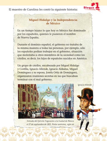 Miguel Hidalgo y la Independencia de México En un tiempo lejano lo que hoy es México fue dominado por los españoles, quienes le pusieron el nombre de Nueva España. Durante el dominio español, el gobierno no trataba de la misma manera a todas las personas, por ejemplo, sólo los españoles podían trabajar en el gobierno, situación que molestaba a otros miembros de la sociedad como los criollos, es decir, los hijos de españoles nacidos en América. Un grupo de criollos, encabezado por Miguel Hidalgo y Costilla, Ignacio Allende, Ignacio Aldama, Miguel Domínguez y su esposa, Josefa Ortiz de Domínguez, organizaron reuniones secretas en las que buscaban terminar con el mal gobierno. Ignacio Allende