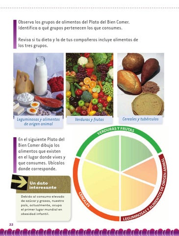 Observa los grupos de alimentos del Plato del Bien Comer. Identifica a qué grupos pertenecen los que consumes. Revisa si tu dieta y la de tus compañeros incluye alimentos de los tres grupos.