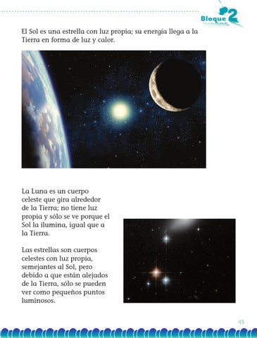 La Luna es un cuerpo celeste que gira alrededor de la Tierra; no tiene luz propia y sólo se ve porque el Sol la ilumina, igual que a la Tierra. Las estrellas son cuerpos celestes con luz propia, semejantes al Sol, pero debido a que están alejados de la Tierra, sólo se pueden ver como pequeños puntos luminosos. 45