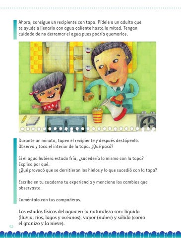 Durante un minuto, tapen el recipiente y después destápenlo. Observa y toca el interior de la tapa. ¿Qué pasó? Si el agua hubiera estado fría, ¿sucedería lo mismo con la tapa? Explica por qué. ¿Qué provocó que se derritieran los hielos y lo que sucedió con la tapa? Escribe en tu cuaderno tu experiencia y menciona los cambios que observaste. Coméntalo con tus compañeros.