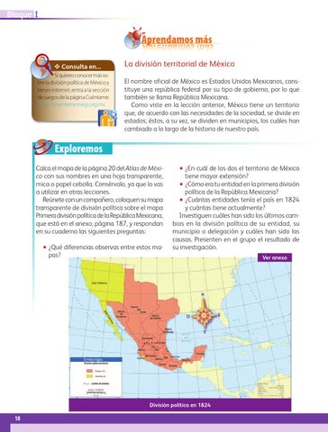 Exploremos Calca el mapa de la página 20 del Atlas de México con sus nombres en una hoja transparente, mica o papel cebolla. Consérvalo, ya que lo vas a utilizar en otras lecciones. Reúnete con un compañero, coloquen su mapa transparente de división política sobre el mapa Primera división política de la República Mexicana, que está en el anexo, página 187, y respondan en su cuaderno las siguientes preguntas: