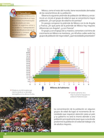 Bloque III México, como el resto del mundo, tiene necesidades derivadas de las características de su población. Observa la siguiente pirámide de población de México y encierra en un círculo el grupo de edad en que se concentra la mayor población. ¿En qué grupo de edad te encuentras? En parejas comparen la pirámide de México con la de Angola y Francia. ¿En qué parte de la pirámide de México hay mayores diferencias con Angola?, ¿y con Francia? En grupo y con el apoyo de su maestro, comenten: si el ritmo de crecimiento en México se mantiene, ¿en 40 años cuáles serán los grupos de población de mayor edad?, ¿qué necesidades presentarán?