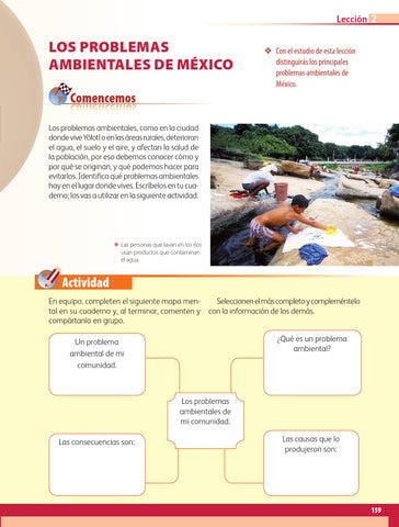 Comencemos Los problemas ambientales, como en la ciudad donde vive Yólotl o en las áreas rurales, deterioran el agua, el suelo y el aire, y afectan la salud de la población, por eso debemos conocer cómo y por qué se originan, y qué podemos hacer para evitarlos. Identifica qué problemas ambientales hay en el lugar donde vives. Escríbelos en tu cuaderno; los vas a utilizar en la siguiente actividad.