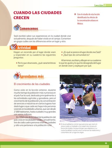 Aprendamos más El crecimiento de las ciudades Como viste en la lección anterior, durante mucho tiempo la población más numerosa en el país fue la rural, dedicada principalmente a las actividades agrícolas y ganaderas, pero el crecimiento de la población y la concentración de servicios e industrias en ciertos lugares han dado lugar a que cada vez haya más personas viviendo en localidades urbanas, que van desde 2 500 habitantes, hasta ciudades muy grandes con varios millones. En 1950 más de la mitad de la población del país vivía en localidades rurales; actualmente, tres de cada cuatro personas viven en ciudades y sólo una pertenece a la población rural.
