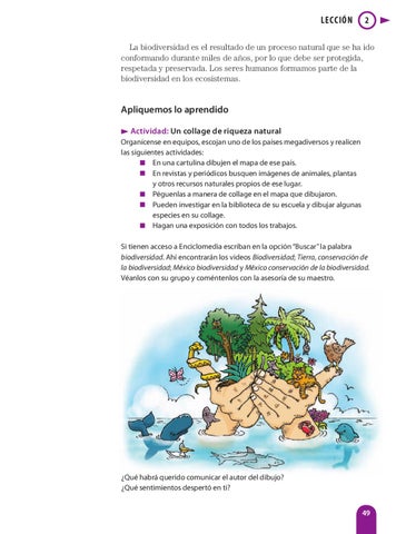 Apliquemos lo aprendido Actividad: Un collage de riqueza natural Organícense en equipos, escojan uno de los países megadiversos y realicen las siguientes actividades: En una cartulina dibujen el mapa de ese país. En revistas y periódicos busquen imágenes de animales, plantas y otros recursos naturales propios de ese lugar. Péguenlas a manera de collage en el mapa que dibujaron. Pueden investigar en la biblioteca de su escuela y dibujar algunas especies en su collage. Hagan una exposición con todos los trabajos. Si tienen acceso a Enciclomedia escriban en la opción “Buscar” la palabra biodiversidad. Ahí encontrarán los videos Biodiversidad; Tierra, conservación de la biodiversidad; México biodiversidad y México conservación de la biodiversidad. Véanlos con su grupo y coméntenlos con la asesoría de su maestro.